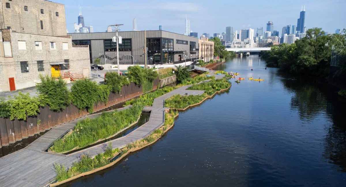 O Wild Mile, um projeto de jardins flutuantes e áreas verdes, está transformando Chicago. Essa iniciativa impulsionou a construção de calçadões ao longo do rio, promovendo o turismo e o comércio local.